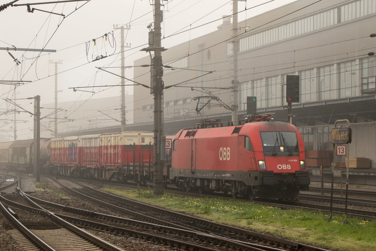 Die 2016 911 mit einem Güterzug am 18.04.2019 unterwegs bei Bichlbauer.