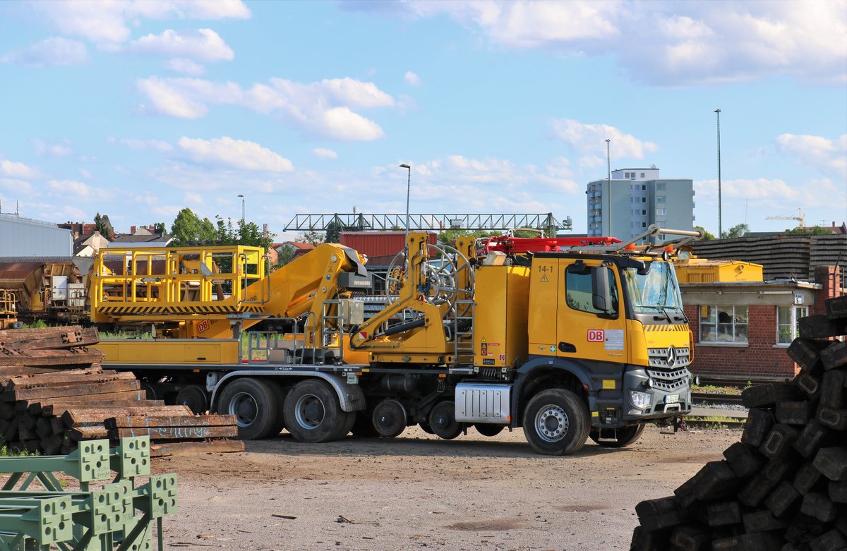 DB Bahnbaugruppe Mercedes Benz Arocs Zweiwegehubwagen am 08.06.19 in Hanau über den Zaun fotografiert