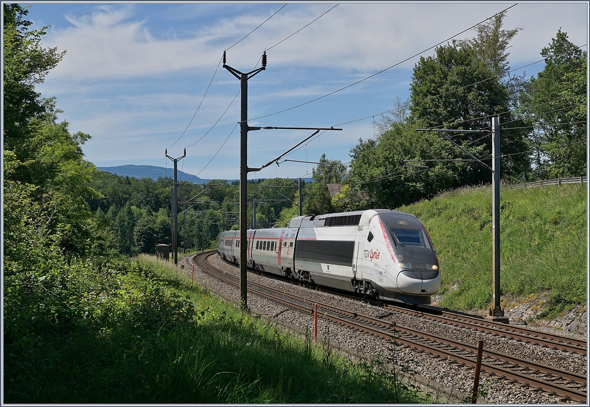 Der von Paris kommende TGV Lyria 9269 mit dem Triebzug (Rame) 4404 kurz vor Bussigny und damit kurz vor seinem Ziel Lausanne. 8. Juni 2019