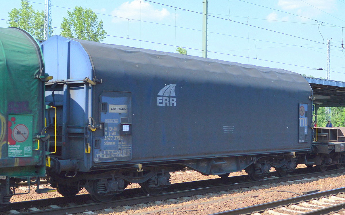 Drehgestell-Flachwagen mit Schiebeplane für Coil-Transporte vom Einsteller ERR vermietet an Captrain mit der Nr. 37 TEN-RIV 80 D-ERR 4677 379-2 Shimmns Bf. Duisburg-Hafen am 05.06.19 Bf. Flughafen Berlin-Schönefeld.