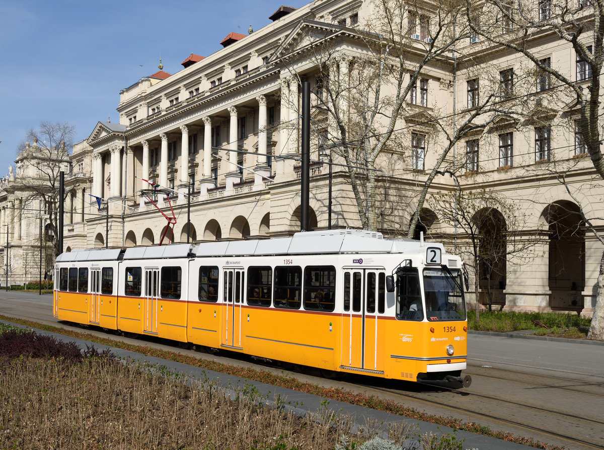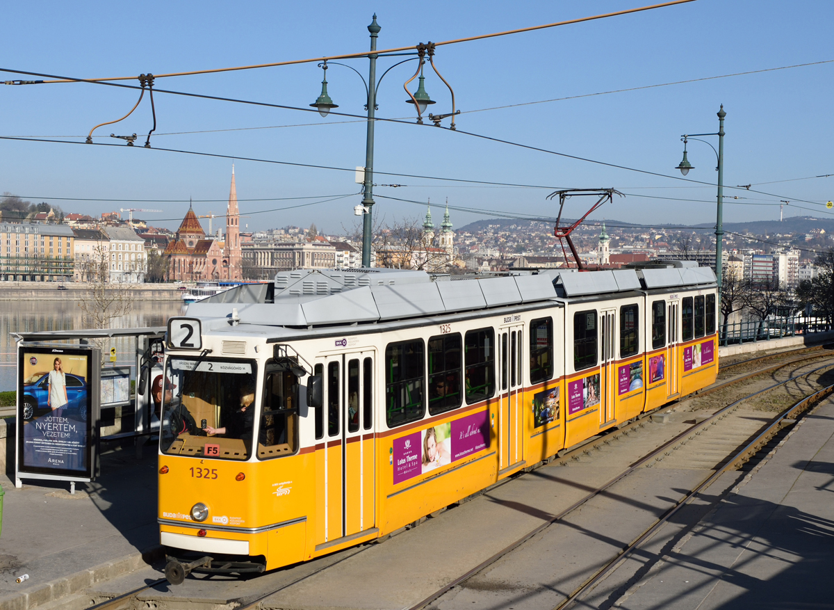 Ganz KCSV–7 1325 hält am frühen morgen des 01. April 2019 in der Station Széchenyi István tér, im Hintergrund zu erkennen die Szilágyi Dezső téri református Kirche sowie die Felsővízivárosi Szent Anna Kirche.