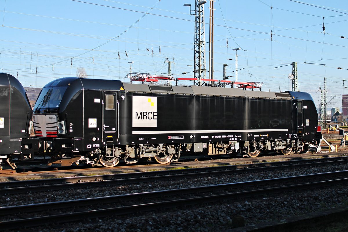 Lokportrait am 13.02.2018 von MRCE 191 022 (ex. 5 170 021), als diese zusammen mit MRCE 191 021 im südlichen Vorfeld vom Badischen Bahnhof von Basel abgestellt war und dort auf die Überführung nach Italien warteten.