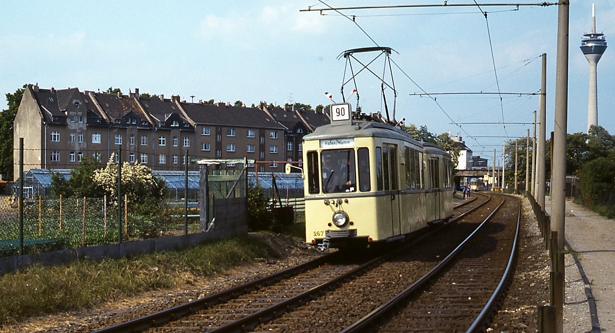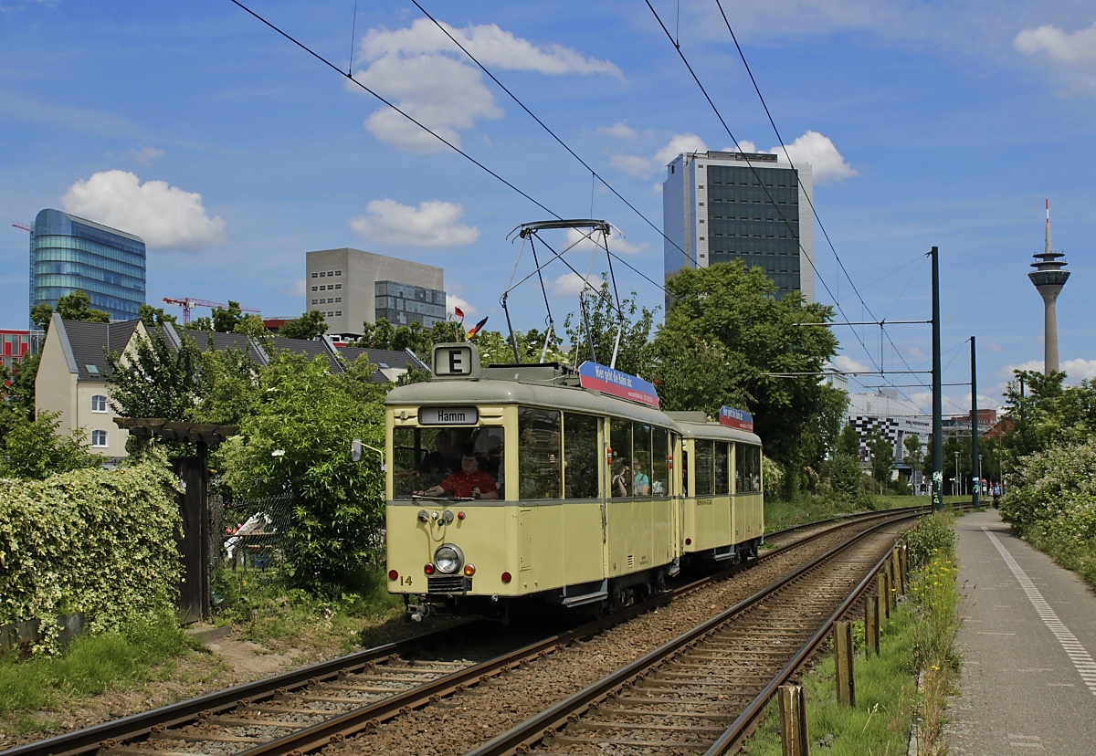 Anlässlich des 625-jährigen Jubiläums des heutigen Düsseldorfer Stadtteils Hamm setzten die Rheinbahn und der Verein Linie D am 09.06.2019 insgesamt sechs Museumszüge ein, die am Nachmittag im 15-Minuten-Takt kostenlos zwischen dem Hauptbahnhof und Hamm verkehrten, hier verlassen der GT6 2432 und Bw 1700 die Haltestelle am Hauptbahnhof. Der GT6 2432 ist 100. an die Rheinbahn gelieferte Gelenkwagen.