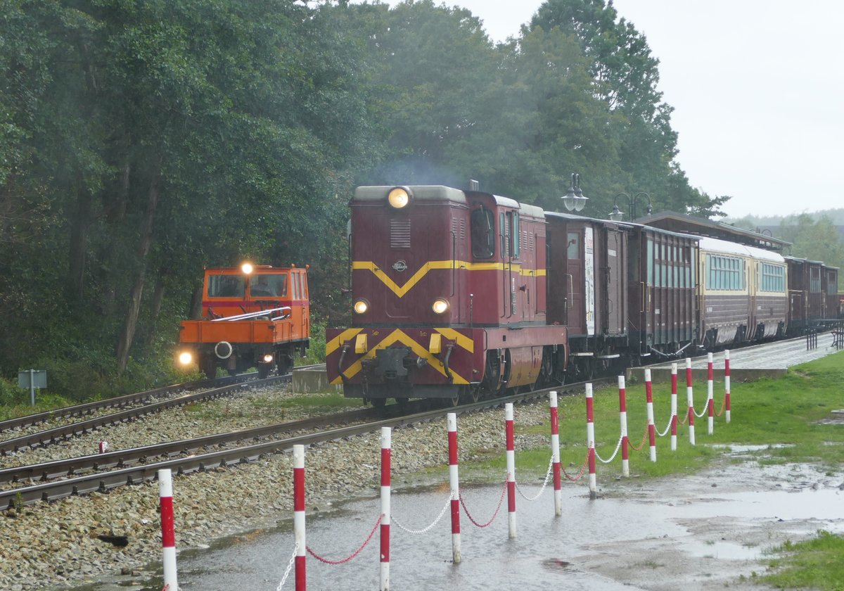 07.09.2017, Polen. Bahnhof Niechorze der Schmalspurbahn (Gryfice) - Trzesacz - Pogorzelica. Lok Lxd2 472 setzt ihre Fahrt in östlicher Richtung auch bei diesem Sauwetter fort. Die Besatzung des Bahndienstfahrzeug WMC 309 wartete derweil geduldig und blendete für den Fotografen die Lichter auf - Danke.