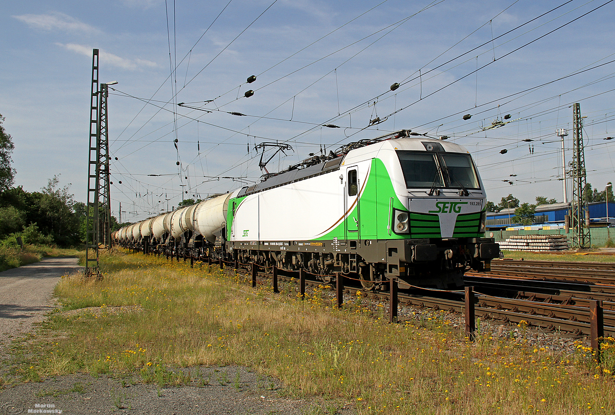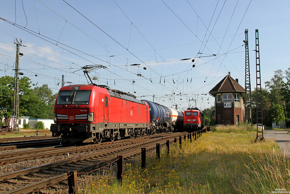 DB Cargo AG mit der weißen blau gestreiften "193 360 - I am European" [NVR-Nummer: 91 80 6193 360-5 D-DB] und einem gemischten Güterzug am 18.06.19 Vorbeifahrt Bahnhof Hamburg Harburg.