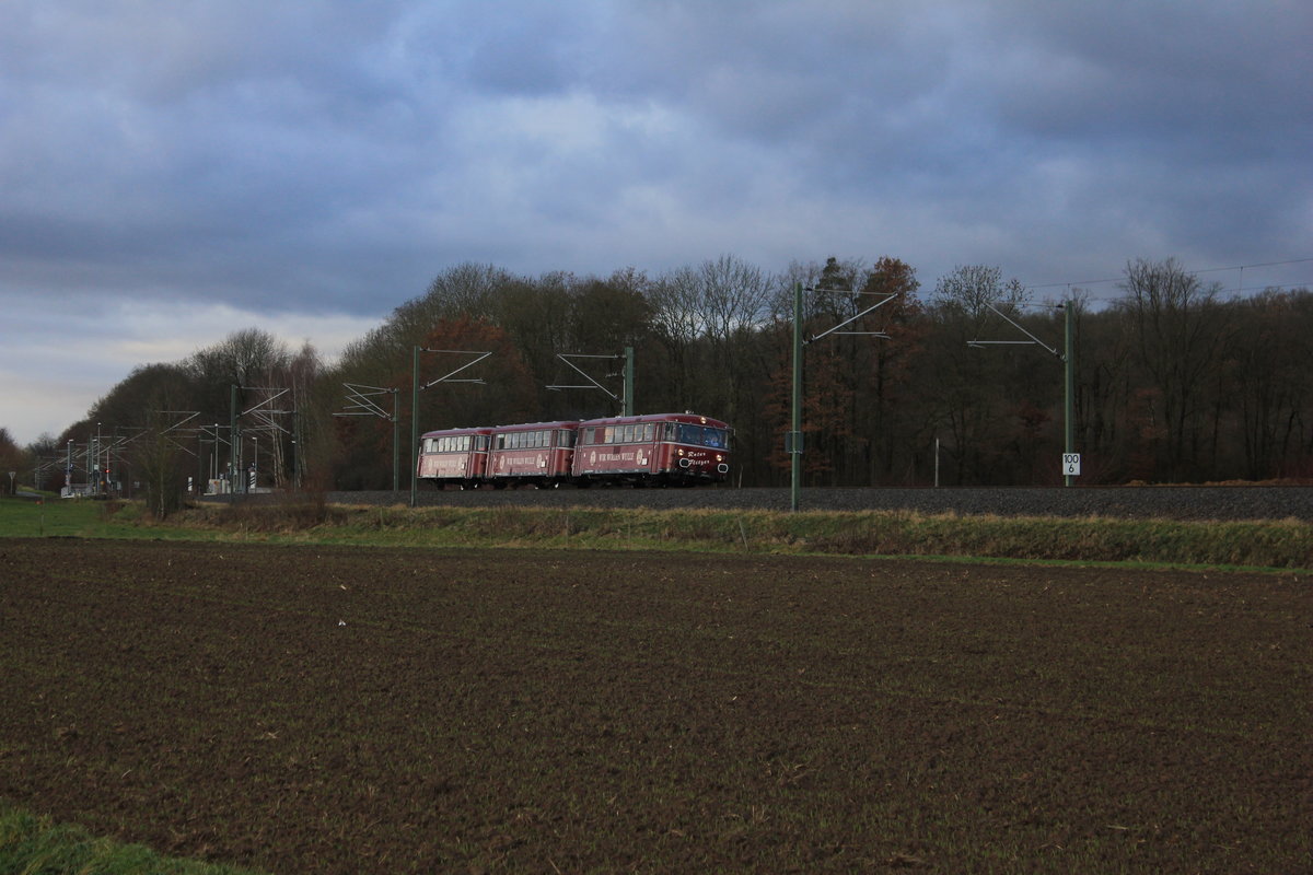 Am 15.12.2012 fahren drei VT 798 "Roter Flitzer" anlässlich einer Sonderfahrt zum Christkindlmarkt nach Nürnberg bei Obersulm-Wieslensdorf über die Hohenlohebahn.