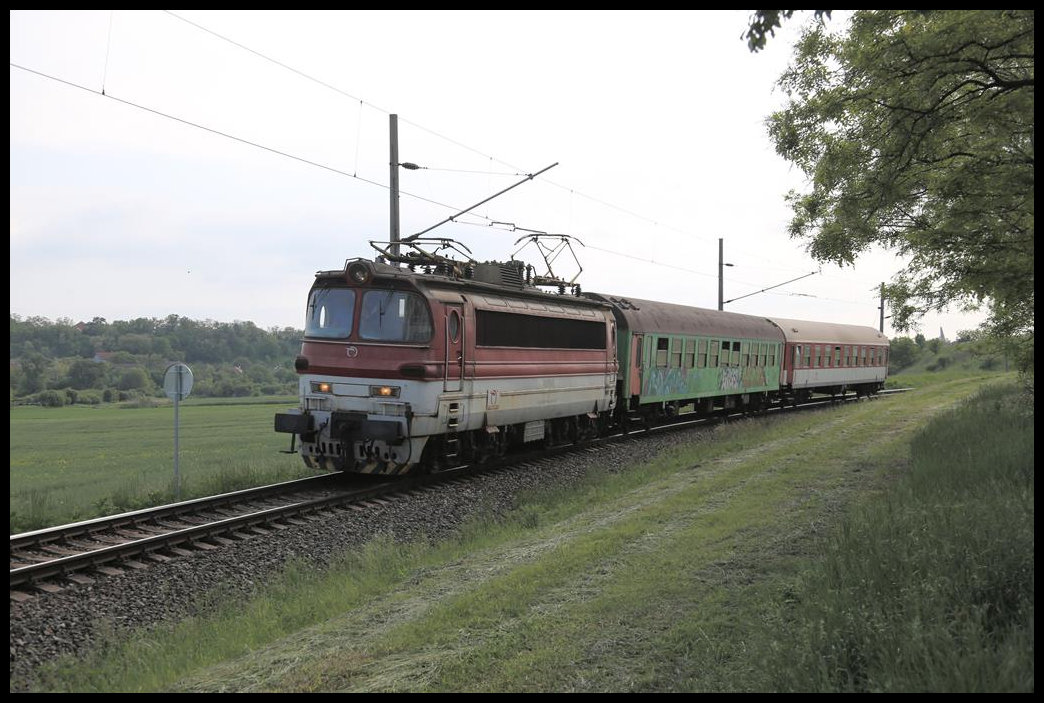 Am 17.5.2019 pendelte diese Garnitur mit 240115 recht desolat ausschauenden Wagen zwischen Podhajska und Surany. Als Zug 5225 kam sie mir bei Radava vor die Linse.