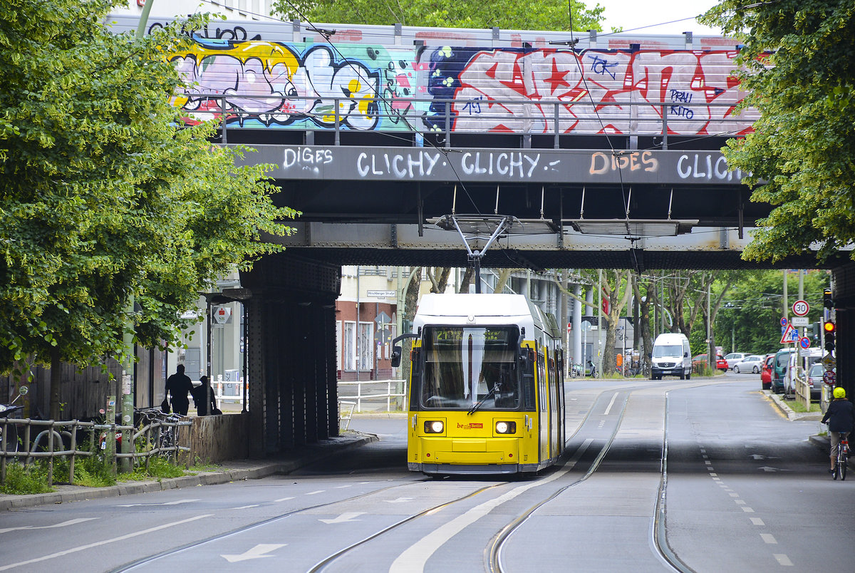 Linie M13 (Wedding-Warschauer Straße) - Wagen 8014 und 8034 Baureihe Flexity in Holteistraße, Berlin-Friedrichshain. Aufnahme: 8. Juni 2019.