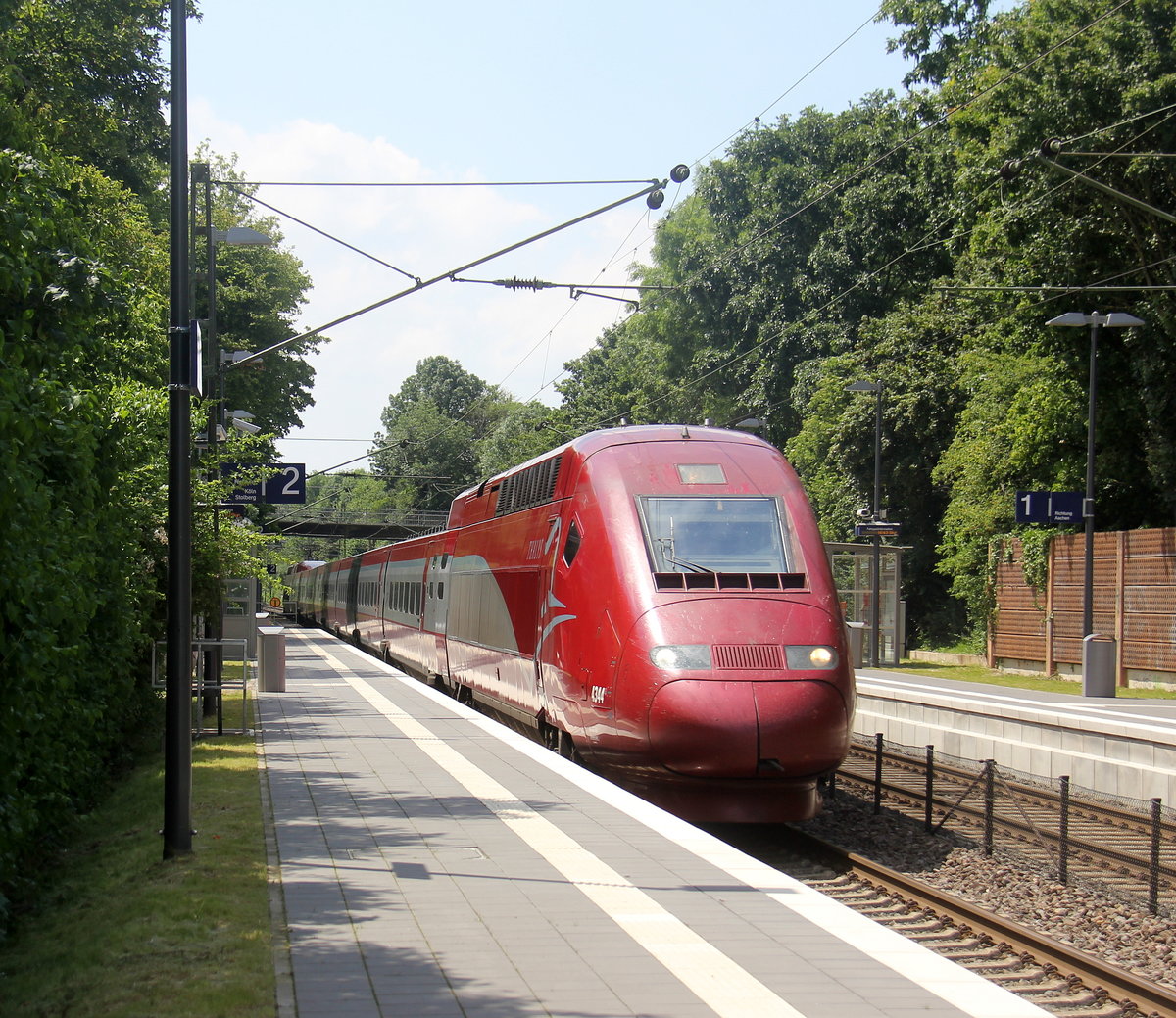 Der Thalys aus Paris(F) nach Köln-Hbf(D) und kommt aus Richtung Aachen-Hbf und fährt durch Aachen-Eilendorf in Richtung Köln. Aufgenommen vom Bahnsteig 2 in Aachen-Eilendorf. Bei Sommerwetter am Nachmittag vom 15.6.2019.