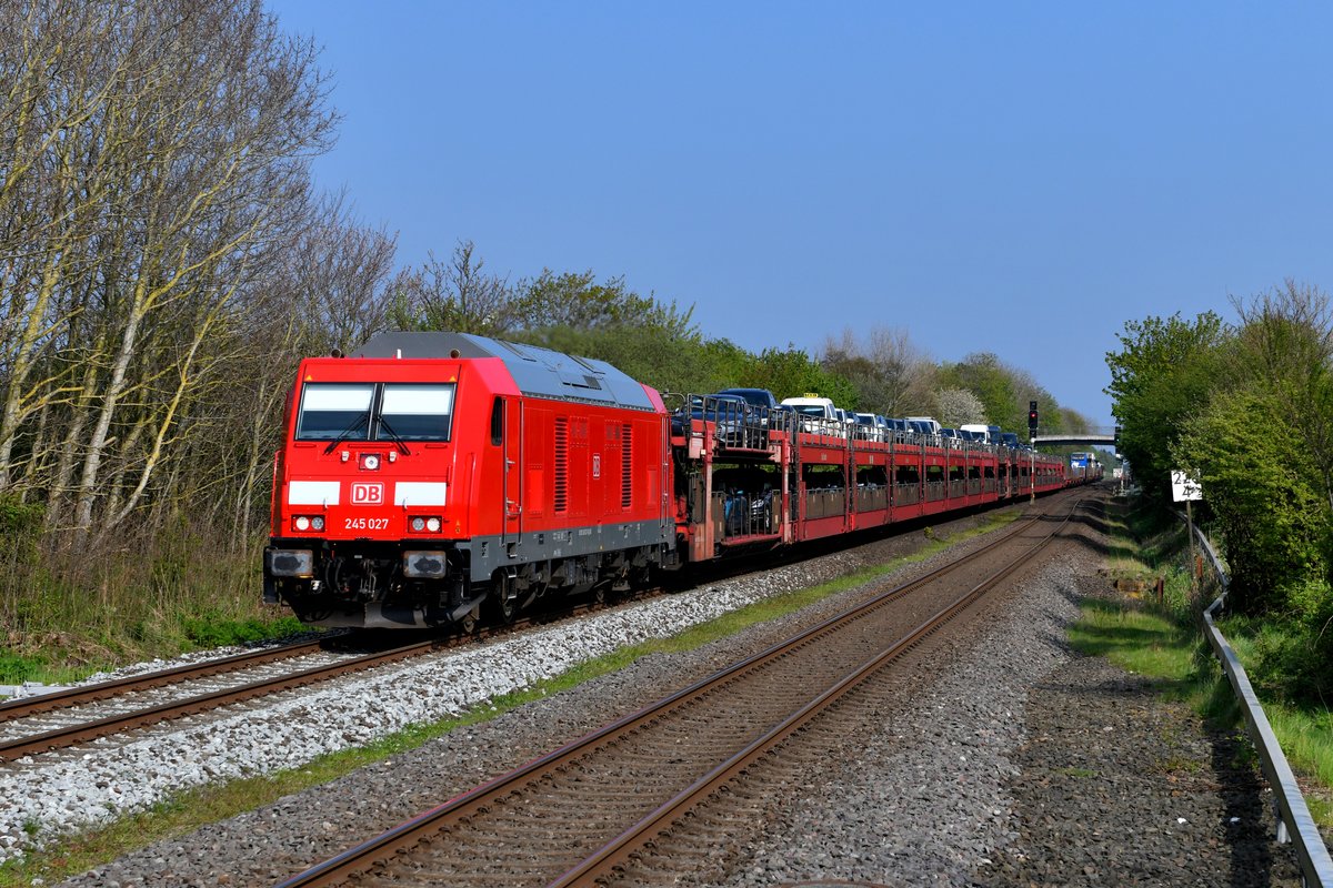 Die Baureihe 245 sollte eigentlich die Beförderung der Züge des Sylt Shuttles komplett übernommen haben. Im Frühjahr 2019 waren sie aber eher die Ausnahme als die Regel vor den Autotransportzügen zwischen Niebüll und Westerland. Am 29. April 2019 konnte ich 245 027 vor einem gut ausgelasteten Sylt Shuttle bei Morsum ablichten.