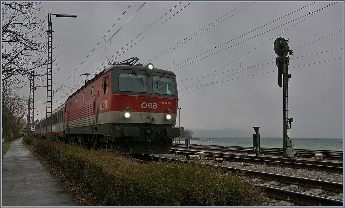 Europäische Lok-Klassiker aus den 70ern und 80ern auch heute noch im Einsatz: Die ÖBB 1144 042 verlässt mit dem IC Bodensee Lindau Richtung Innsbruck.