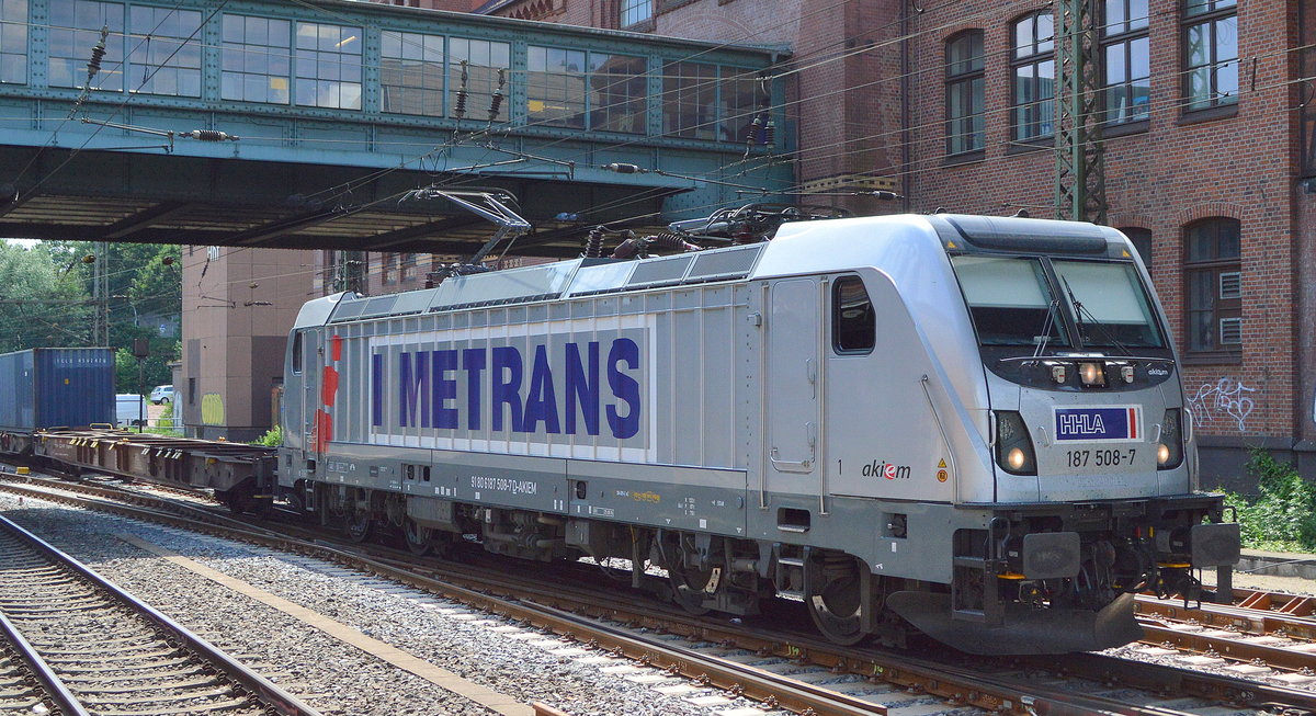 METRANS Rail (Deutschland) GmbH mit der akiem "187 508-7" [NVR-Nummer: 91 80 6187 508-7 D-AKIEM] und Containerzug auf der Strecke zum Hamburger Hafen, 18.06.19 Bahnhof Hamburg Harburg.