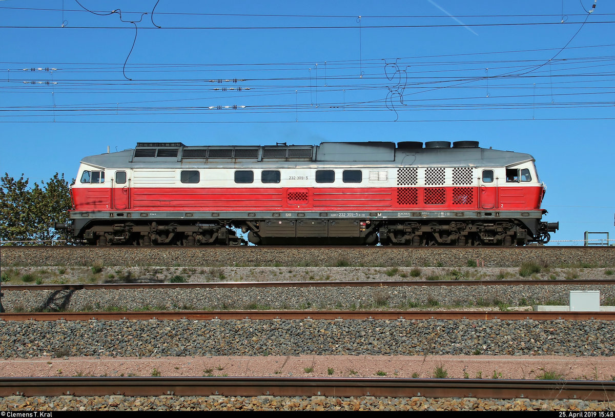 Seitliches Portrait von 232 309-5 DB, die in Halle (Saale), Karl-von-Thielen-Straße (Gebiet der DR), auf der Ostumfahrung für den Güterverkehr von einem Schüttgutzug in südlicher Richtung abkoppelte, um wenig später 187 126-8 DB diesen übernehmen zu lassen.
