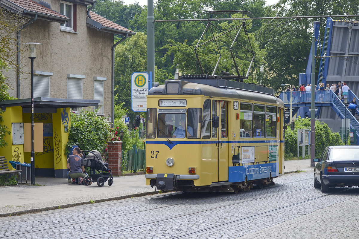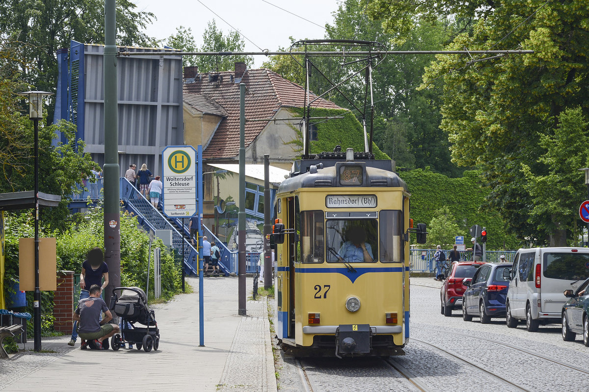 Woltersdorf Straßenbahn Wagen 27 an der Haltestelle Woltersdorf Schleuse. Aufnahme: 10. Juni 2019.