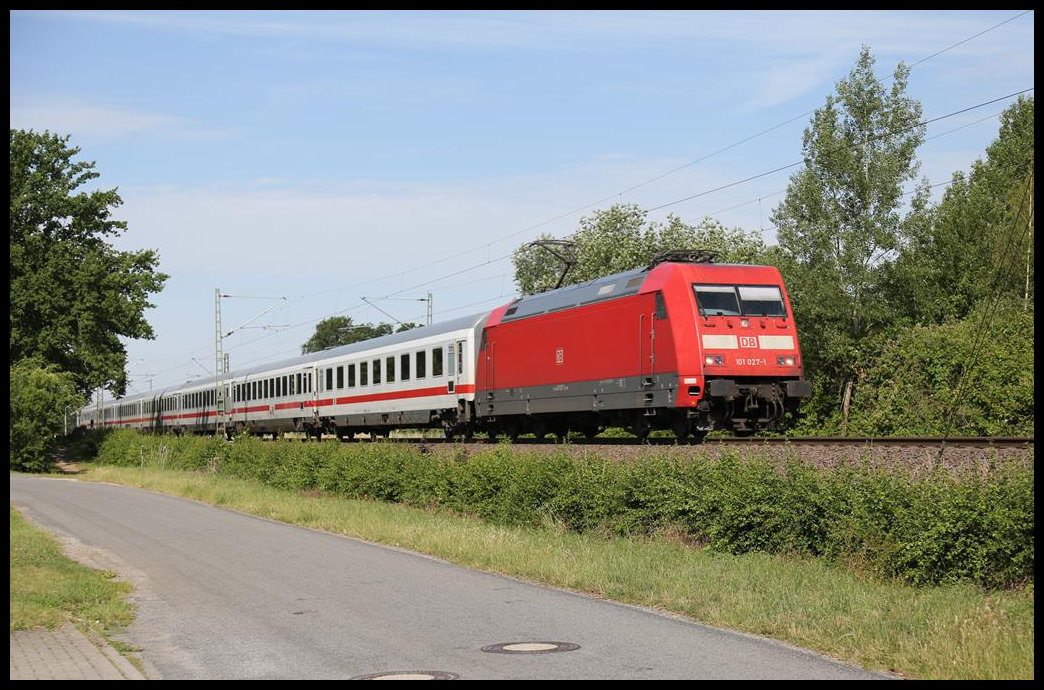 101027-1 mit Intercity Richtung Osnabrück am 25.6.2019 um 10.07 Uhr am Ortsrand von Hasbergen.