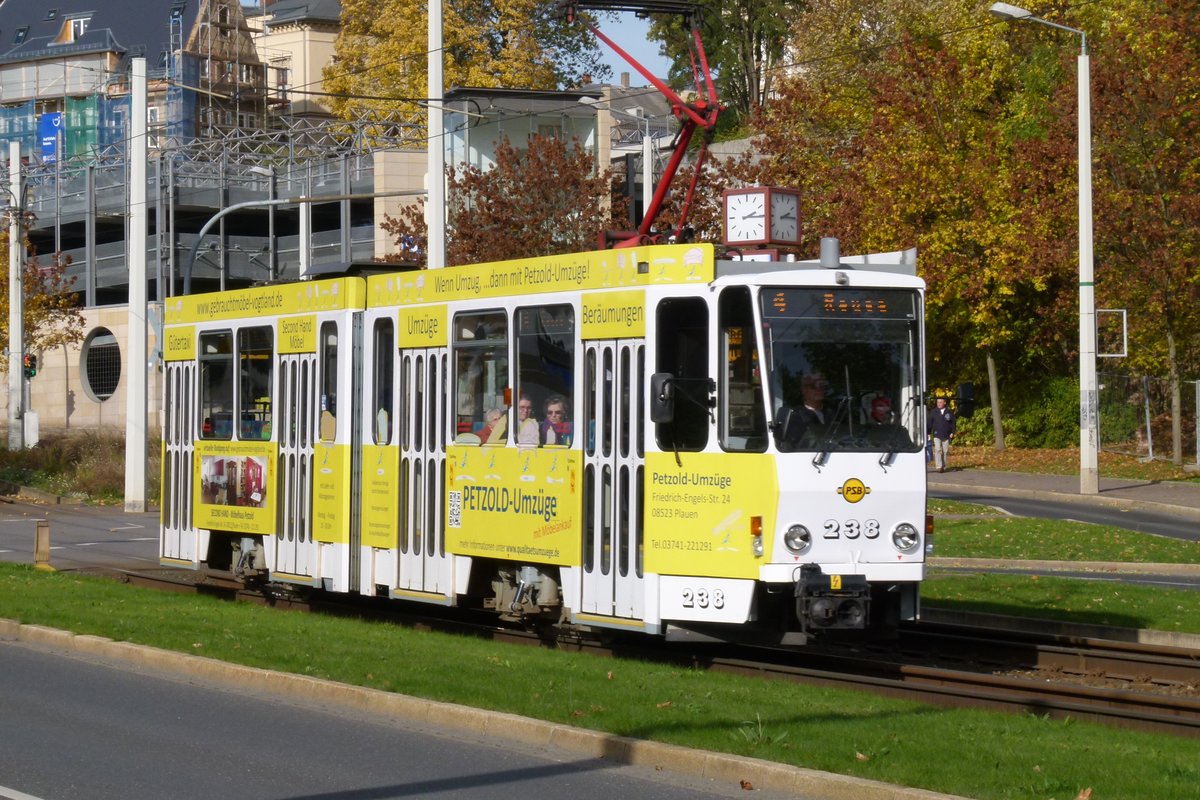 24. Oktober 2015, Straßenbahn in Plauen/Vogtland. Triebwagen KT4D-M Nr. 238
