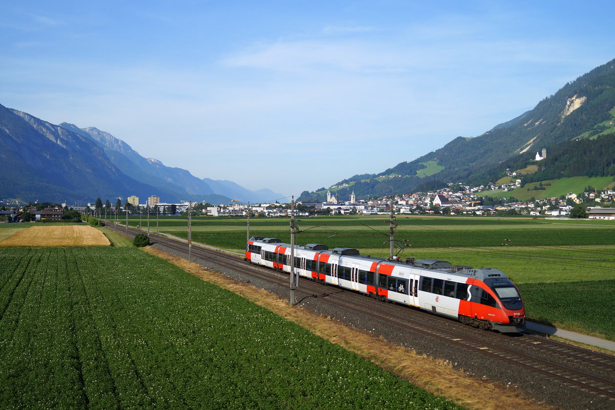 Der ehemalige Innsbrucker 4024 099-6, noch erkennbar an den S-Bahn-Tirol-Aufklebern, stattete am 25. Juni 2019 seiner alten Heimat einen Kurzbesuch ab, da er sich von seinem neuen Heimatbundesland Vorarlberg zu einem Untersuchungstermin nach Salzburg aufmachte. Als Leerzug fährt er bei Schwaz im besten Abendlicht in Richtung Kufstein.