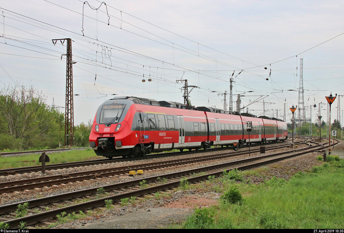 442 804 (Bombardier Talent 2) des Franken-Thüringen-Express (FTX | DB Regio Bayern) als RE 4987 von Leipzig Hbf nach Nürnberg Hbf fährt in Großkorbetha auf der Bahnstrecke Halle–Bebra (KBS 580).