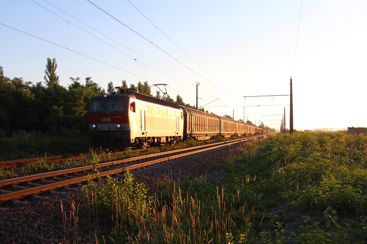 Am 26.6.2019 steht im Sonnenaufgang über den Weiten der Gegend um den Bahnhof Mitterndorf-Moosbrunn die 1144 124 mit dem G54505 am Weg von Wien Zvb nach Villach Süd Gvbf Einfahrgruppe.