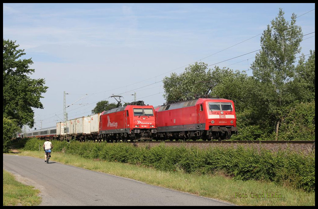 Auf den ersten Blick könnte es eine Überholung sein, was auf der Rollbahn in Hasbergen technisch durchaus möglich wäre und auch hin und wieder vorkommt. In diesem Fall ist es aber am 25.6.2019 um 9.43 Uhr eine Zug Begegnung zwischen der Rhein Cargo l85588-1, die mit ihrem Container Zug in Richtung Osnabrück unterwegs ist, und der DB 120133-4, die Ihren Intercity in Richtung Münster schiebt. Bei so einem Zufall störte mich dann auch die Radfahrerin nicht mehr.