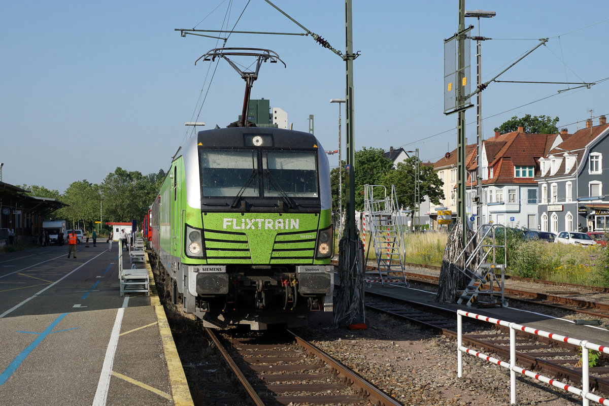 Ankunft im Güterbahnhof Lörrach mit grüner FLIXTRAIN Vectron.