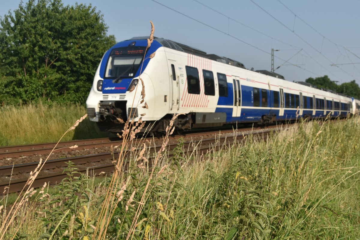 Bei diesem Bild habe ich mal den Bewuchs am Bahndamm in den Vordergrund gestellt, als der RE 7 aus Neuss nach Krefeld durchfuhr am Mittwochabend den 26.6.2019.