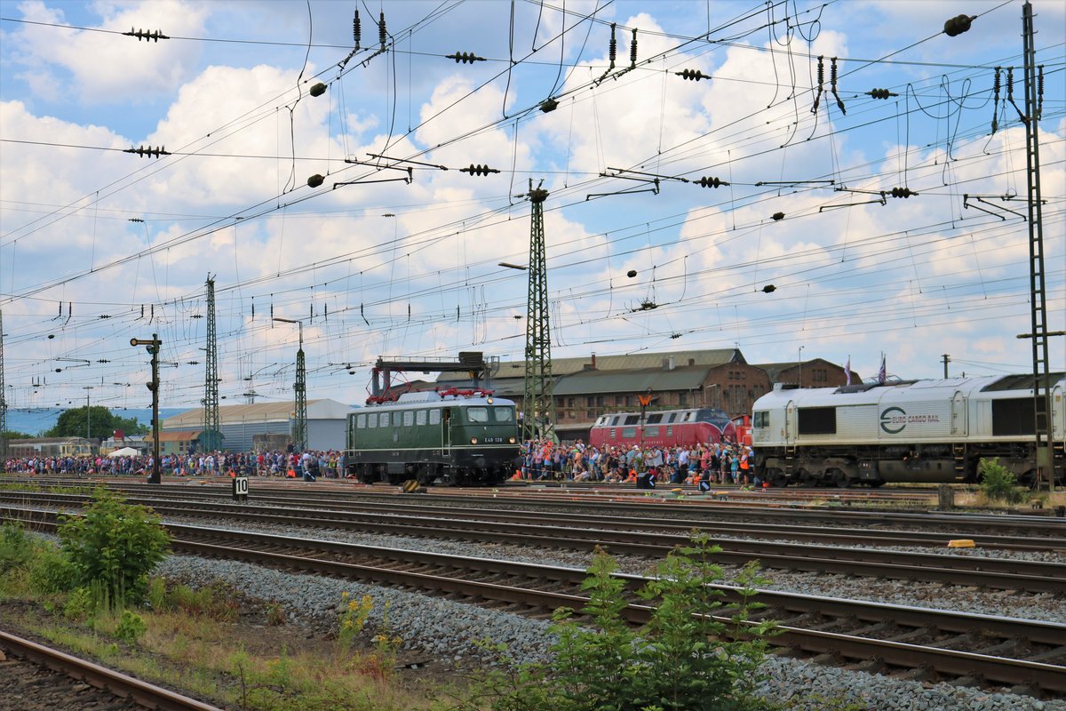 DB Museum E40 128 beim Sommerfest im DB Museum Koblenz Lützel am 22.06.19. Von einen Gehweg aus fotografiert. Die Bundespolizei hat die Fotografen überwacht damit nichts passiert