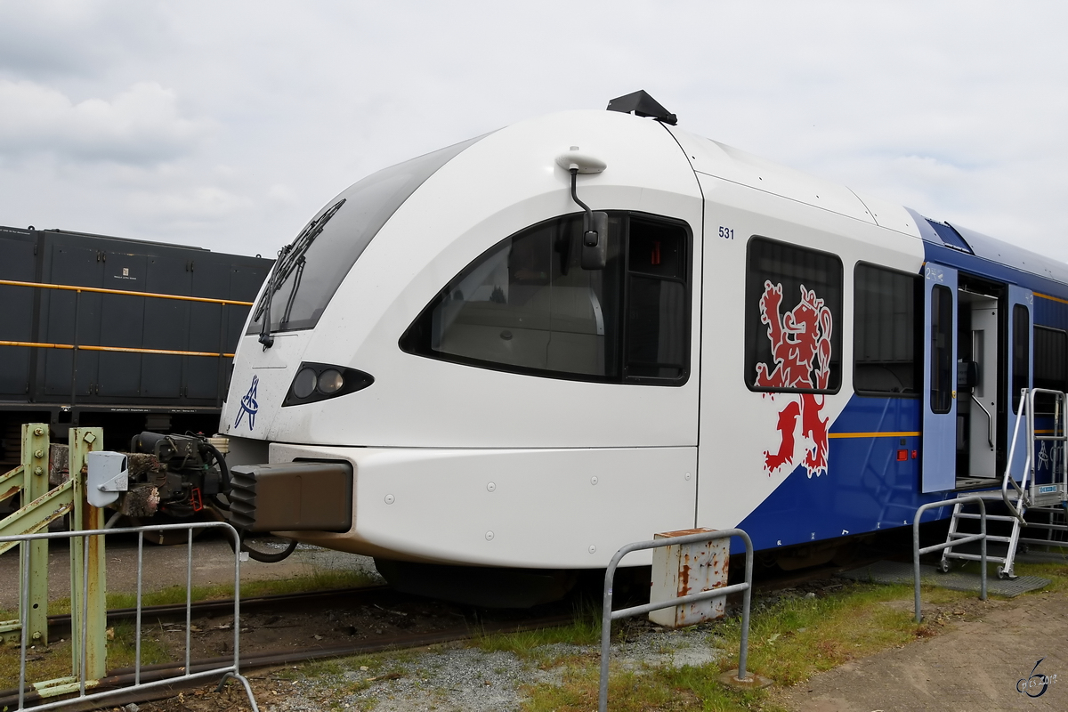 Noch mit Registrierung der Stadler Pankow GmbH unterwegs, dieser grüne dreiteilige Triebzug vom Typ Typ FLIRT³ mit der Nr. 3427 004 A (NVR-Nummer: 94 80 3427 004-1 D-STAP) am 24.06.19 Saarmund Bahnhof. Ich nehme an eine Testfahrt?