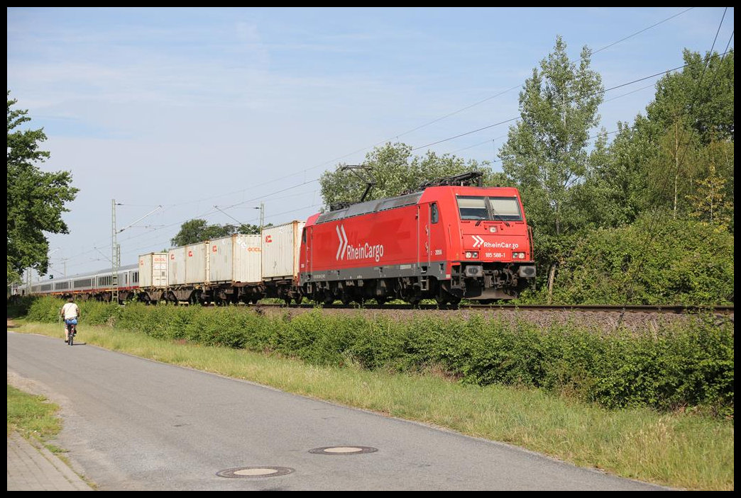 Die Rhein Cargo 185588-1 kam am 25.6.2019 um 9.43 Uhr mit einem Container Zug auf der Rollbahn in Hasbergen in Richtung Osnabrück vorbei.