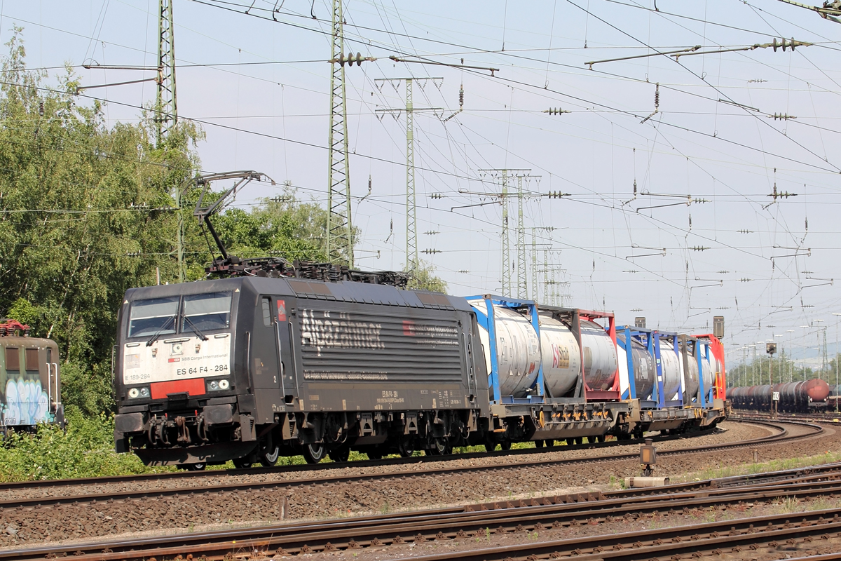 In Allerheiligen kommt die 187 164 mit einem Mischer gen Neuss gefahren am Donnerstag den 20.6.2019