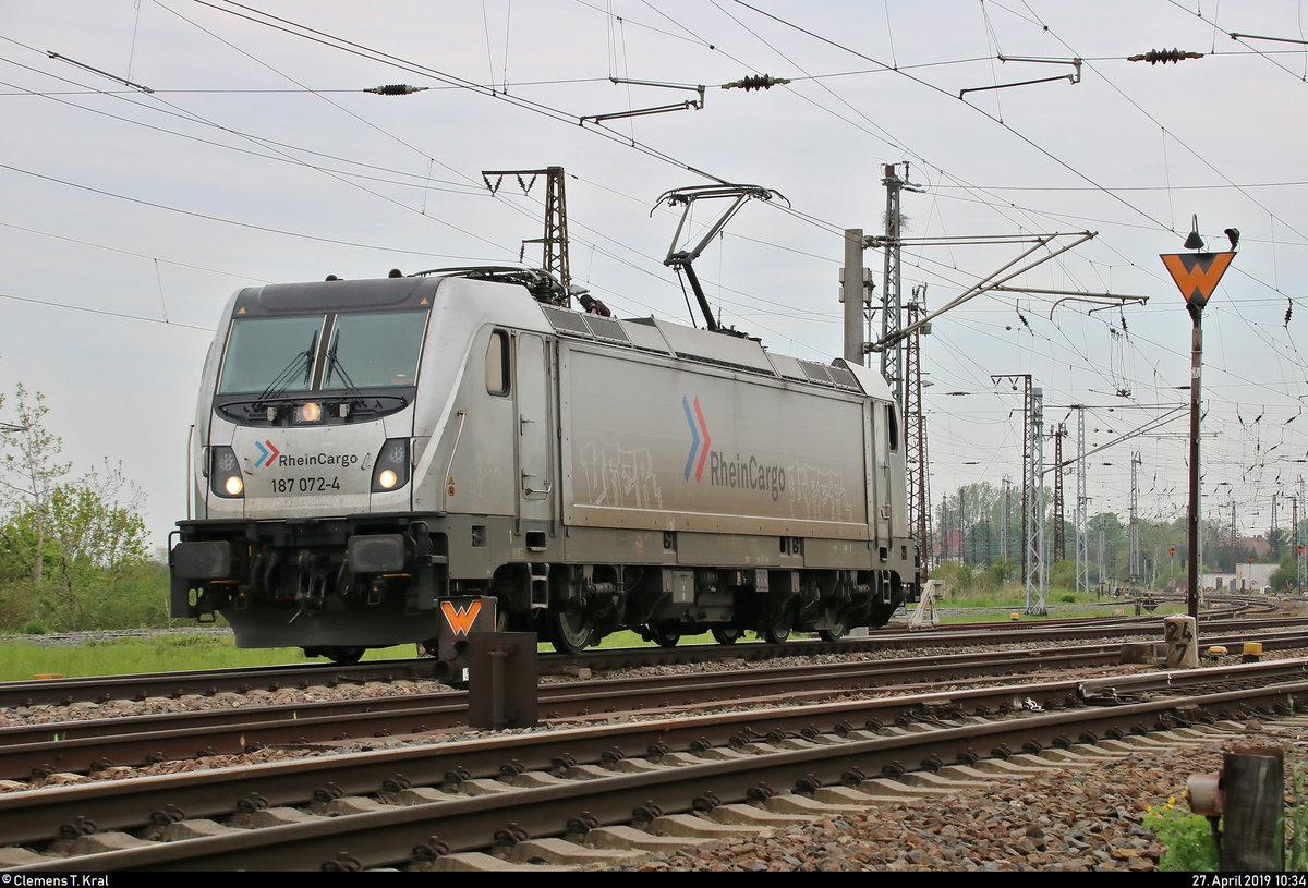 Nachschuss auf 187 072-4 der RheinCargo GmbH & Co. KG, die im südlichen Gleisvorfeld des Bahnhofs Großkorbetha rangiert, nachdem sie ihre Kesselwagen dorthin gebracht hat.