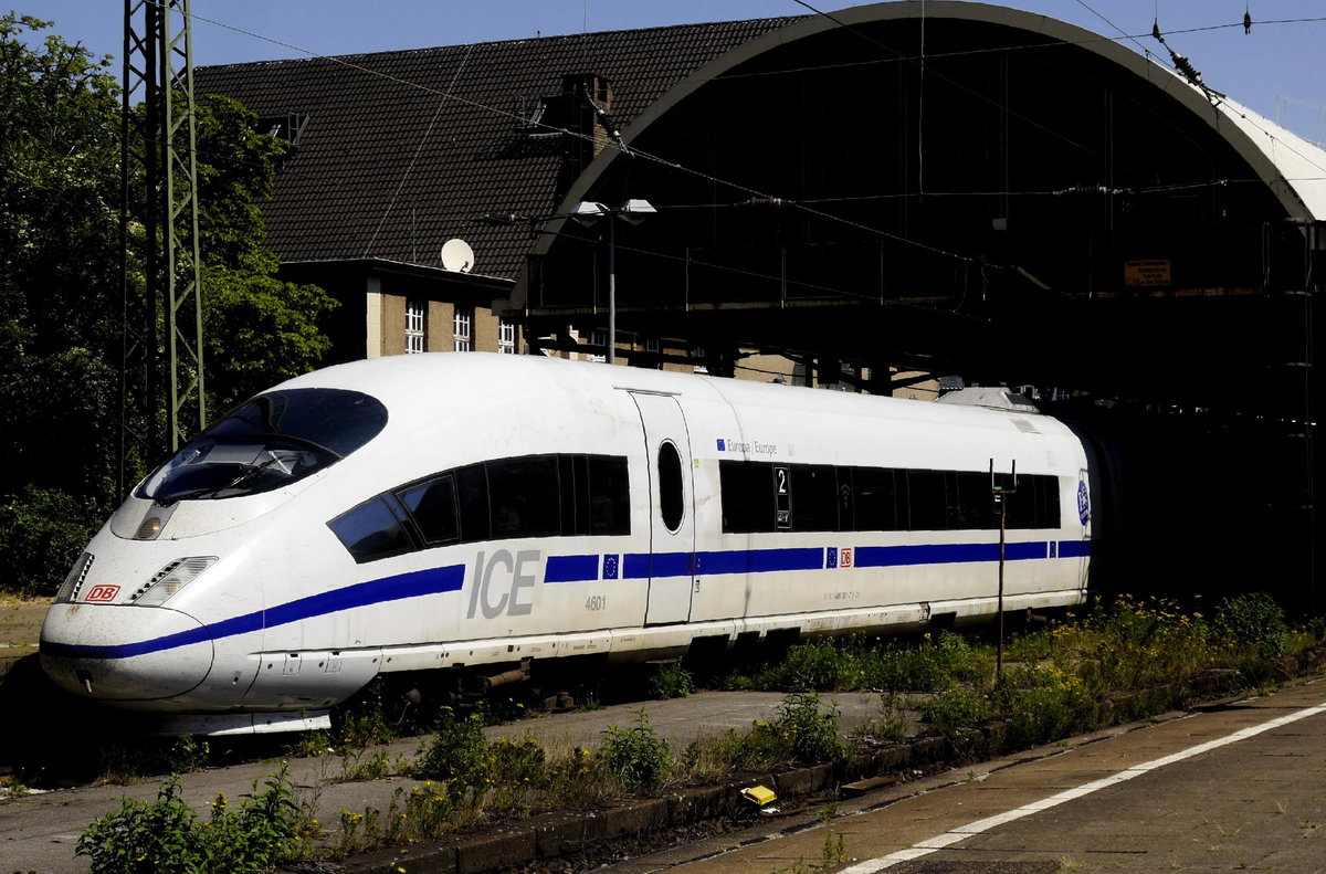 Triebkopf 406 501 sommerlich angestrahlt, den Rest des Zuges verschluckt die Dunkelheit der Halle des Hbf Mönchengladbach. (ICE 153 Amsterdam - Frankfurt, umgeleitet über den Grenzübergang Venlo wegen baustellenbedingter Sperrung der KBS 420, MG Hbf Gleis 1 Ersatzhalt für Duisburg und Düsseldorf, 27.6.19).