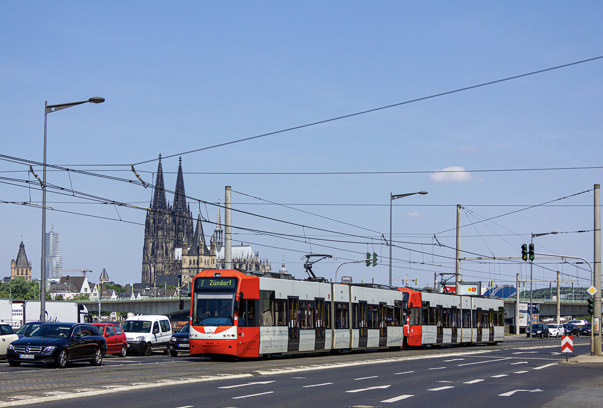Zu einer der bekannteren Fotostellen im Kölner Straßenbahnnetz zählt diese Stelle an der Kölner Severinsbrücke. Hier konnte ich am 23. Juni 2019 die beiden K4500 4545 und 4535 auf der Linie 7 festhalten.