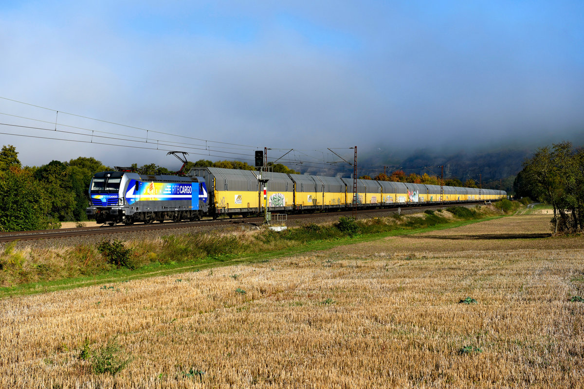 Der Herbst im Maintal läßt Fotos zumeist erst ab dem späteren Vormittag zu. So auch am 05. Oktober 2018, als sich gegen 10 Uhr der Nebel zu lichten begann und sich die Sonne durch die Schwaden kämpfen konnte. Gerade rechtzeitig für den verspäteten DGS 52707 Bremerhaven Kaiserhafen nach Regensburg Ost, der an diesem Tage von der an die Rurtalbahn vermieteten Railpool 193 824 gezogen wurde. Die Lok hatte erst wenige Tage zuvor eine neue Seitenbeklebung erhalten und hört nun auf den Namen Düren. Dort hat die RTB ihren Firmensitz.