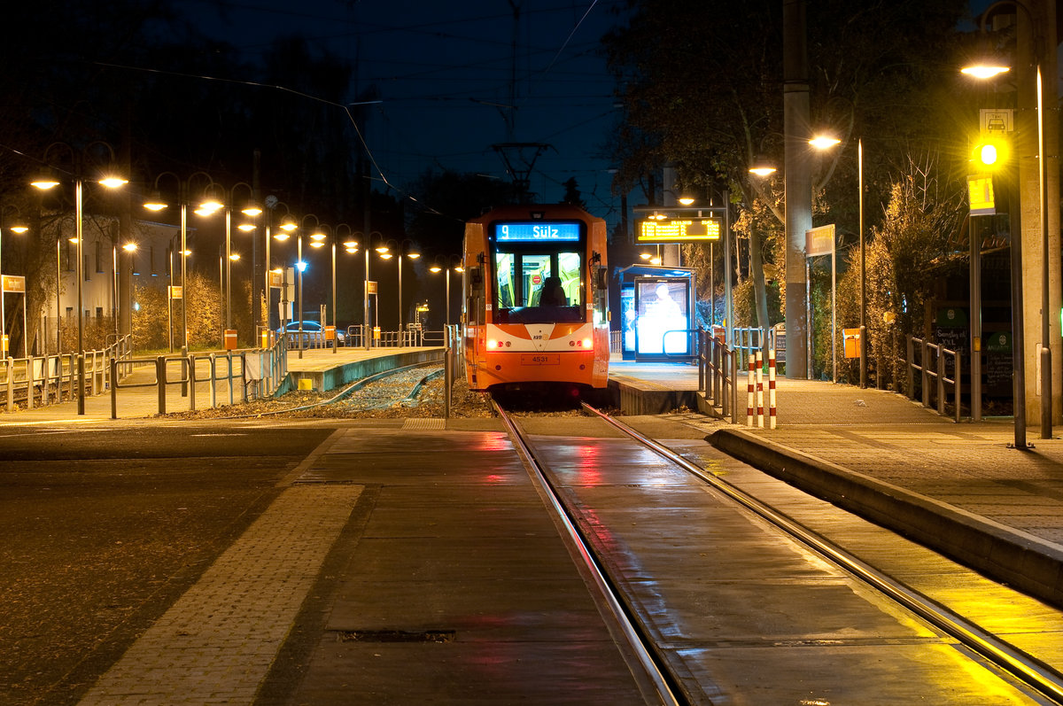 Die Linie bei Nacht an der Haltestelle Königsforst.