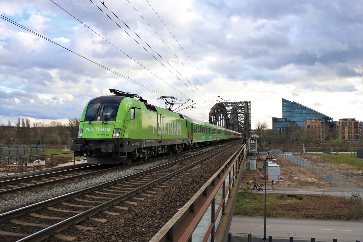 MRCE/Dispolok Flixtrain ES 64 U2-505 (182 505-8) mit dem Flixtrain am 09.03.19 auf der Deutschherrenbrücke in Frankfurt am Main von einen Steg aus fotografiert