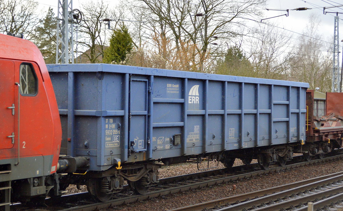 Offener Drehgestellwagen vom Einsteller ERR GmbH mit der Nr. 37 TEN 80 D-ERR 5932 055-6 Eanos (GE) Bf.: Duisburg-Hafen am 08.03.19 Berlin-Hirschgarten.