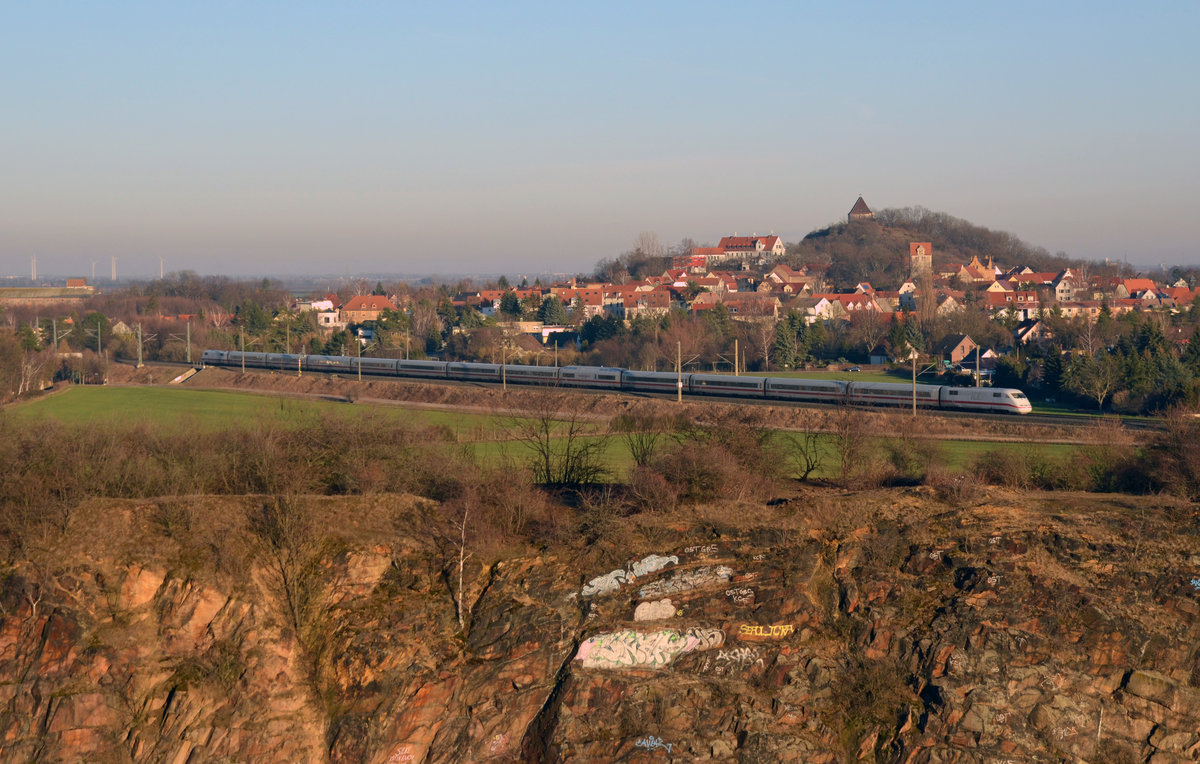 Dieser ICE der Reihe 401 war am 24.02.19 als ICE 709 unterwegs nach München. Hier passiert er auf dem Weg zum Hbf Halle(S) den Landsberger Kapellenberg. Fotografiert vom Landsberger Steinbruch aus.
