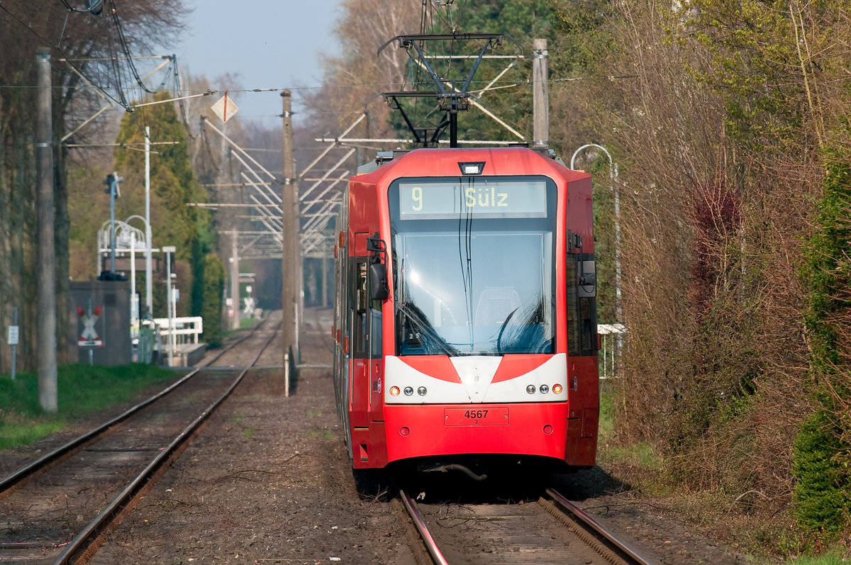 Die Linie 9 mit Wagennummer 4567 auf dem Weh nach Sülz. Aufgenommen an der KVB-Haltestelle Rath/Heumar am 31.3.2019.