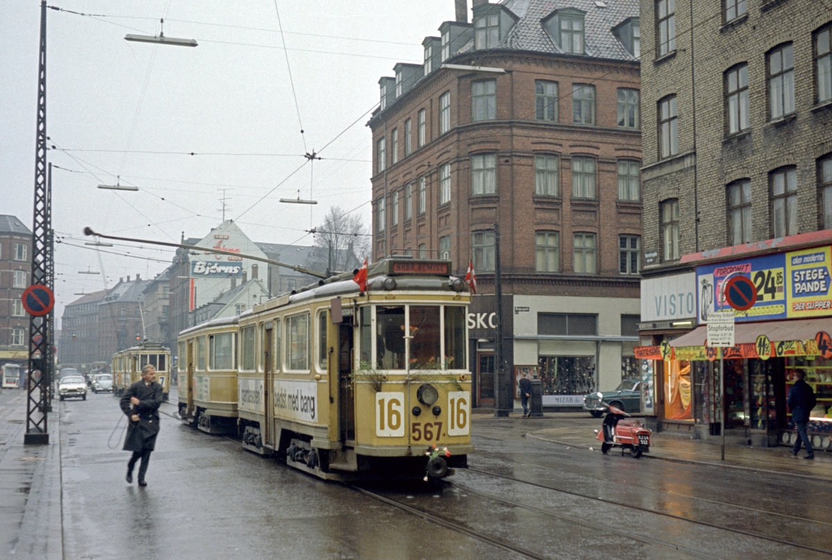 København / Kopenhagen Københavns Sporveje SL 16 (Tw 567 + Bw 15**) København N, Nørrebro, Nørrebrogade / Bragesgade am 25. April 1970. - Die letzte Drehgestellwagengarnitur auf der Linie 16 hat sein Endziel, den Straßenbahnbetriebsbahnhof Nørrebro, erreicht. Aber bevor der Zug in den Betriebsbahnhof rückwärts einrücken konnte, musste der Schaffner die Stromabnehmerstange wenden. - Scan eines Farbnegativs. Film: Kodak Kodacolor X.