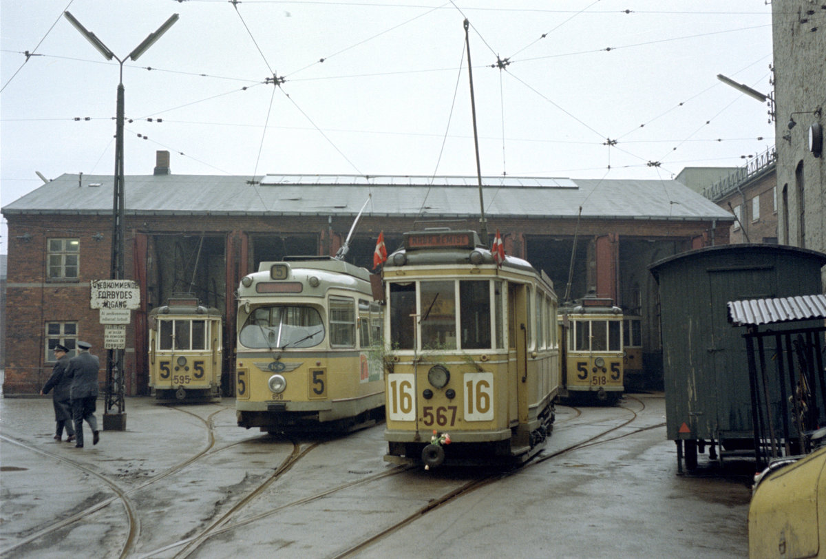 København / Kopenhagen Københavns Sporveje Nørrebro Remise (: Straßenbahnbetriebsbahnhof Nørrebro): Vor einer der Wagenhallen stehen der DÜWAG/Kiepe-GT6 858 als SL 5 und der Drehgestelltriebwagen 567 als SL 16 samt - im Hintergrund - den Drehgestellwagen 595 und 518 als SL 5. - Scan eines Farbnegativs. Film: Kodak Kodacolor X.