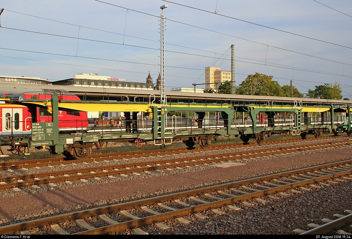 Blick auf einen Autotransportwagen der Gattung "Laaers 224Sc" (23 80 4371 554-5 D-ARS) der ARS Altmann AG, der in einem Autotransportzug (leer) mit 140 810-3 (140 041-5) der Eisenbahn-Bau- und Betriebsgesellschaft Pressnitztalbahn mbH (PRESS) eingereiht ist und Magdeburg Hbf in nördlicher Richtung durchfährt. [7.8.2018 | 19:34 Uhr]