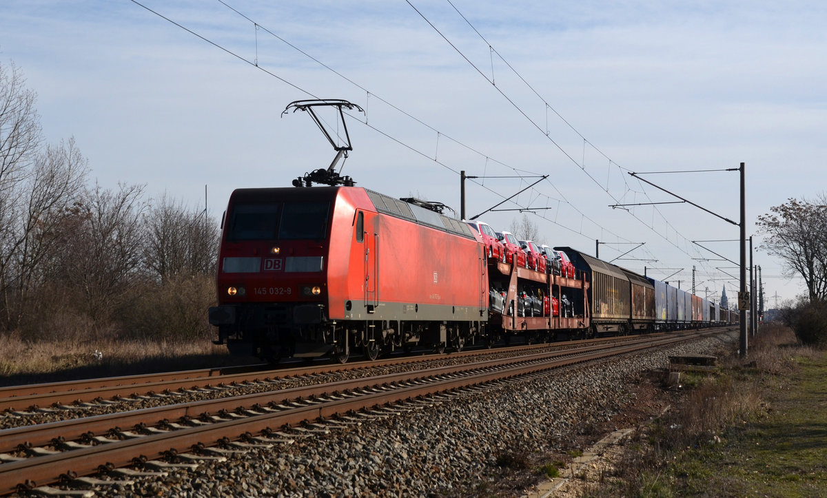 145 032 schleppte am 23.02.19 einen Autologistiker durch Greppin Richtung Dessau.