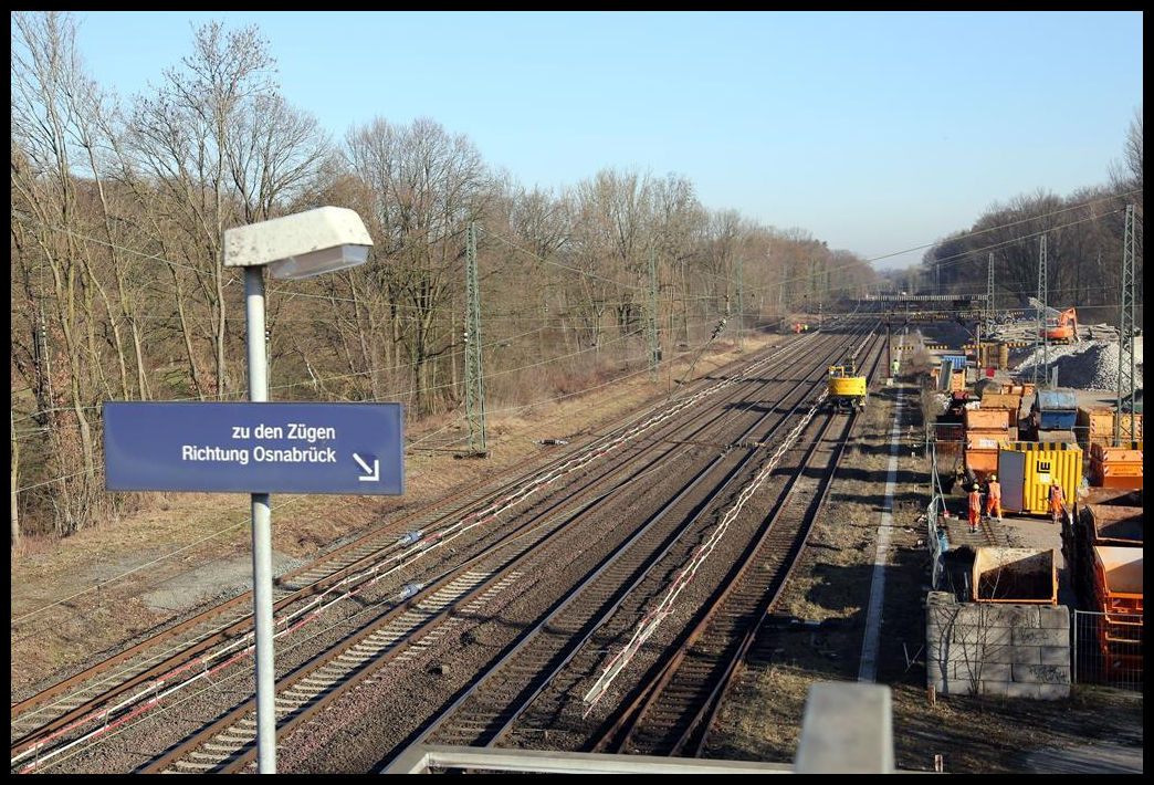 Blick auf den Bahnhof Natrup Hagen an der Rollbahn am 26.02.2019. Noch liegen die beiden verbliebenen Überholgleise. In Blickrichtung Osnabrück ist allerdings schon ein Zweiwegebagger mit dem Abbau des rechten Gleises beschäftigt.