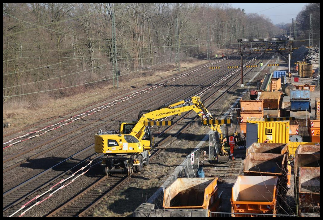 Am 5.3.2019 ist das rechte Überholgleis im Bahnhof Natrup Hagen in Richtung Osnabrück bereits abgebaut worden. Der Zweiwegebagger nimmt gerade die letzten abgetrennten Gleisjoche des Überholgleises in Richtung Münster heraus.