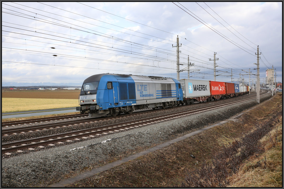 Das Arbeitstier der Steiermark-bahn in Kalsdorf 203.594 , zieht einen soeben angekommen Containerzug in das nahe gelegene Terminal.