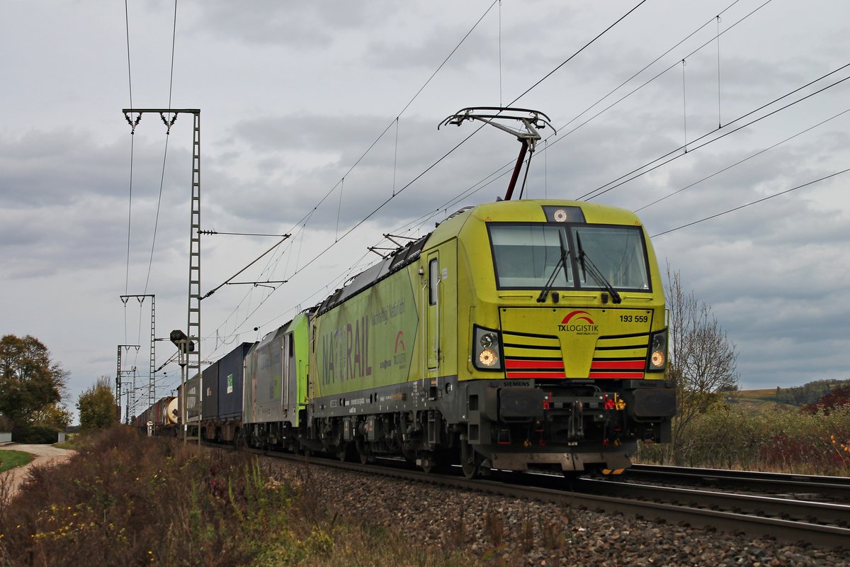 Am Nachmittag des 28.10.2017 fuhr ATLU/TXL 193 559 "NATURAIL" mit einem Containerzug und der Re 486 504 als Wagenlok bei Müllheim (baden) durchs Markgräflerland in Richtung Schweiz.