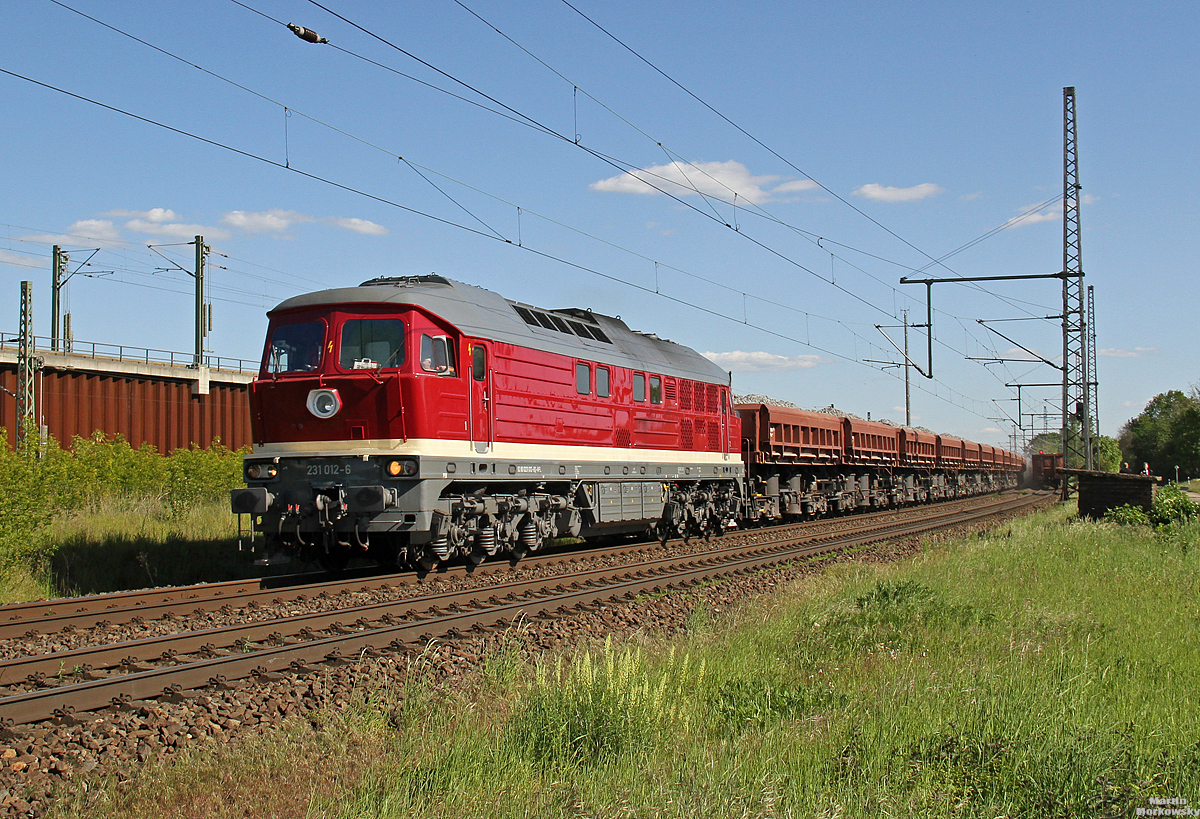 Die WFL 231 012-6 mit einem Schotterzug am Haken in Sechtem gen Brühl fahrend. 17.5.2019