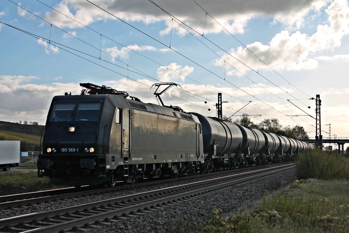 Nachdem am 30.10.2017 die MRCE/SBBCI 185 569-1 ihren Containerzug im Rangierbahnhof von Muttenz abgeliefert hatte, bespannte sie im Anschluss einen leeren Kesselzug aus Glattburg (CH), als sie bei Buggingen in Richtung Freiburg (Breisgau) fuhr.