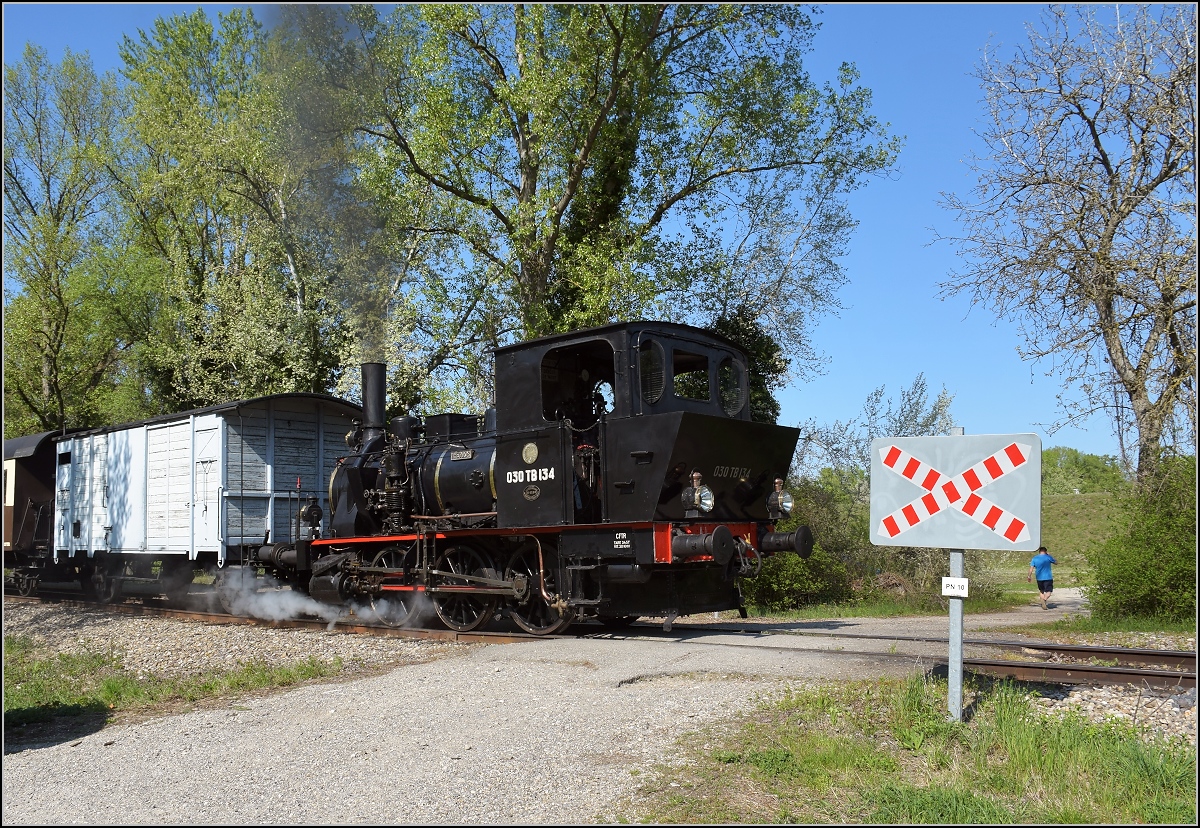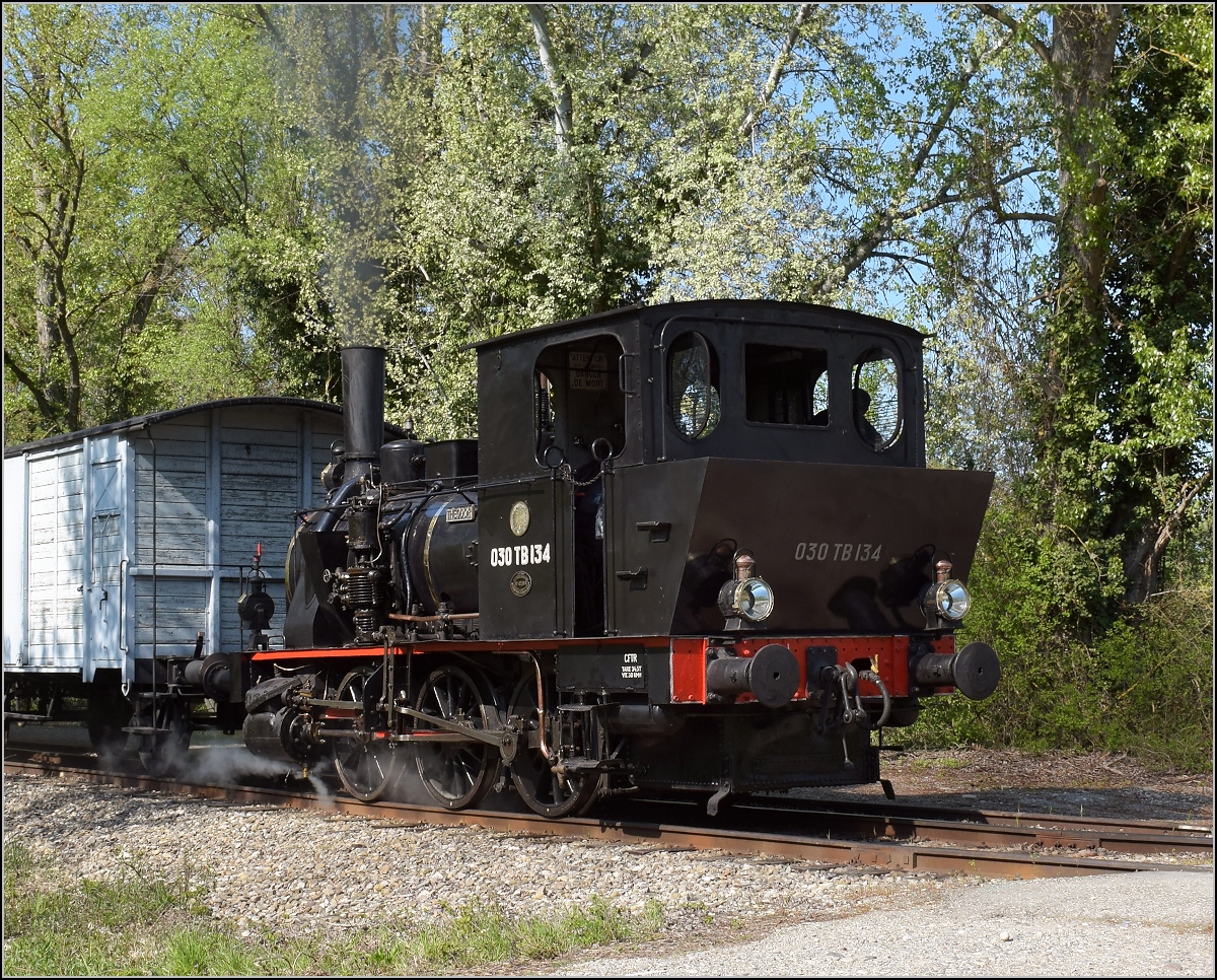 CFTR, die charmante Museumsbahn im Neubreisacher Urwald. Vorbeifahrt 030 TB 134  Theodor  in der Botanik entlang des Rheinseitenkanals. Baltzenheim, April 2019.